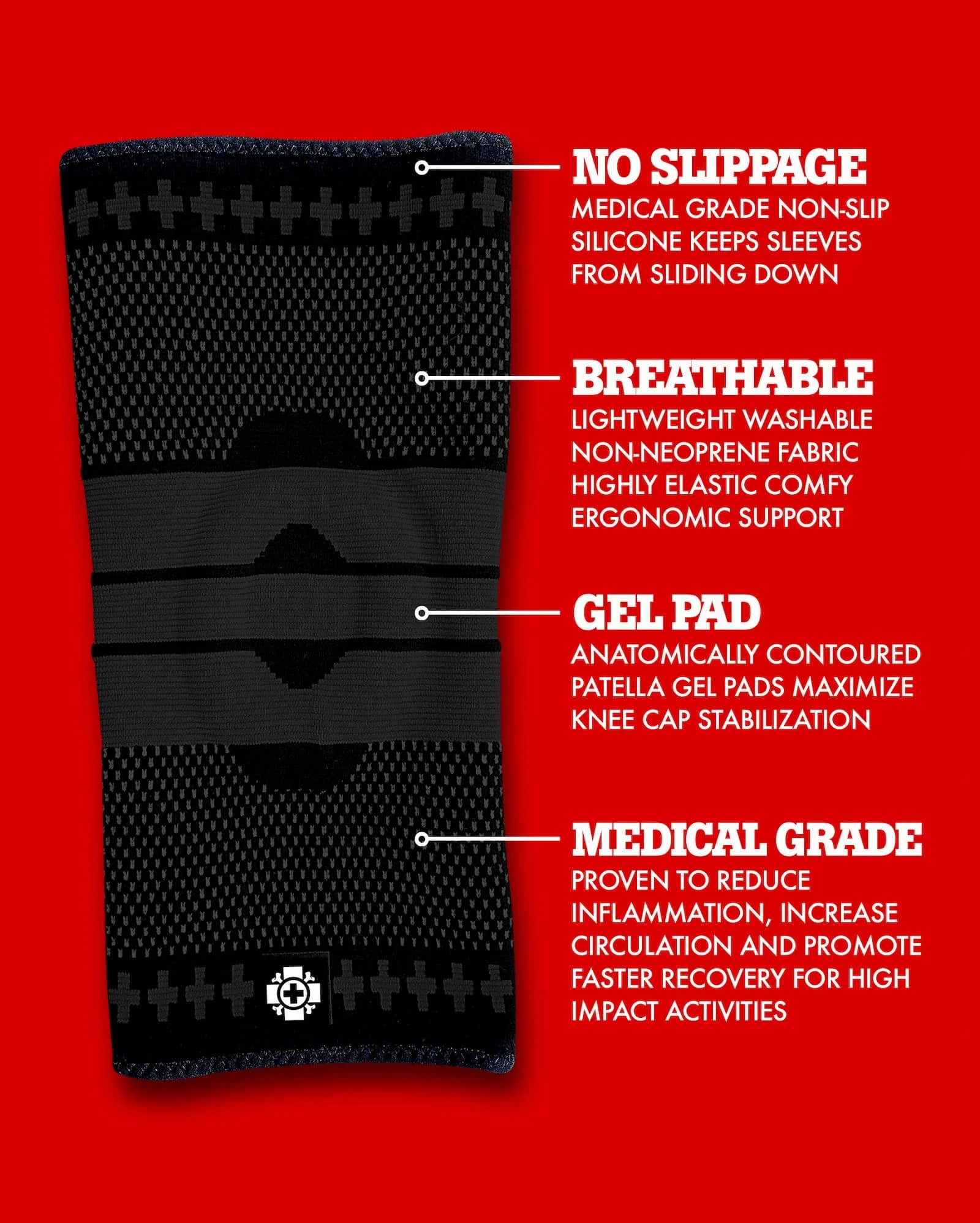 COMPRESSION BENEFITS - Alleviates the effects of high impact activities such as running, basketball and skateboarding. Proven to reduce inflammation and provide pain relief from minor injuries or post surgery aches and pains. Best of all our knitted compression sleeves STAY UP and WON'T SLIDE DOWN!!!